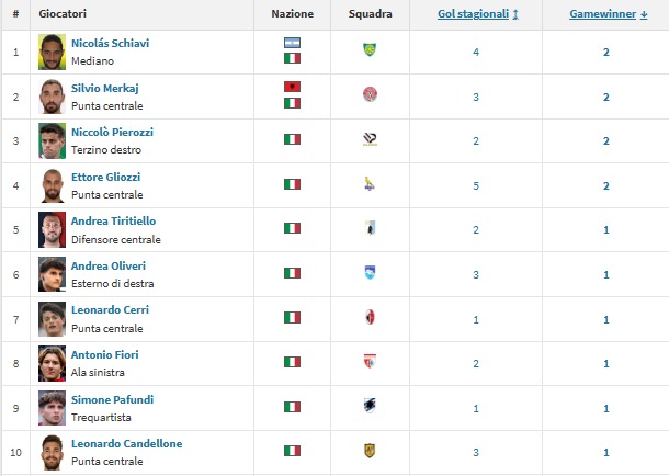 Transfermarkt fornisce una statistica sempre interessante per “pesare” l’impatto dei differenti gol in queste prime 7 giornate di campionato. Ovviamente Ettore Gliozzi ha siglato due volte il gol partita, ma è in compagnia di altri 3 compagni in testa. Non solo un attaccante come Silvio Merkaj, ma anche il terzino destro Niccolò Pierozzi e un centrocampista come Nicolas Schiavi.