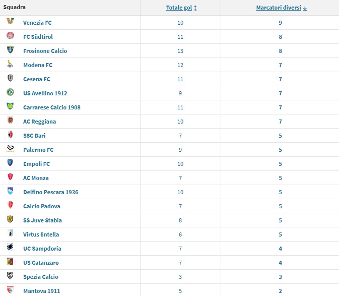 Serie B, le squadre con più marcatori: Venezia cooperativa del gol, Mantova in netta difficoltà