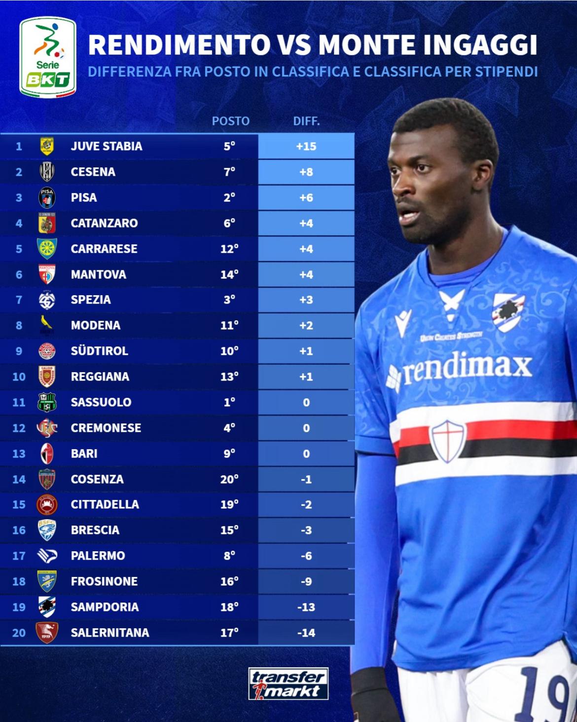 Disastrosa, ovviamente, la retrocessa Sampdoria. Non si tratta però della sola presunta big dal rendimento sconcertante: Frosinone e Salernitana che si giocheranno i playout hanno pagato cifre da playoff, il Palermo avrebbe invece dovuto giocarsela per la promozione diretta. Da segnalare in positivo la gestione della Juve Stabia e quella del Cesena, ai playoff col 15° monte ingaggi.