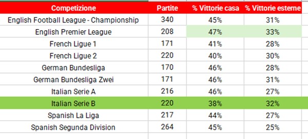 Anche il fattore casa è pressoché inesistente in Serie B, a testimoniare l’imprevedibilità di ogni incontro. Solo il 38% delle volte chi gioca tra le mura amiche porta a casa il risultato pieno. Si tratta anche qui del dato più basso dei 10 tornei presi in esame.