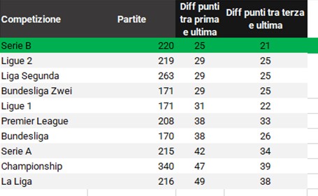 La Lega B diffonde con molto orgoglio attraverso il proprio sito ufficiale le statistiche stagionali che confrontano il campionato con le altre prime e seconde divisioni dei top 5 paesi europei. Quello che emerge è che nessun campionato è altrettanto combattuto: la differenza di punti tra prima e ultima è la più bassa in assoluto.