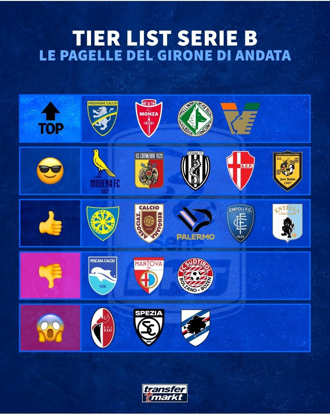 Giunti ufficialmente al giro di boa del campionato di Serie B, è come sempre tempo di bilanci tra conferme, piacevoli sorprese e clamorose delusioni. A redigere il proprio è stato anche il noto portale specializzato Transfermarkt.it, il quale ha stilato la sua personalissima Tier List del girone d’andata in cadetteria divisa in cinque fasce.
