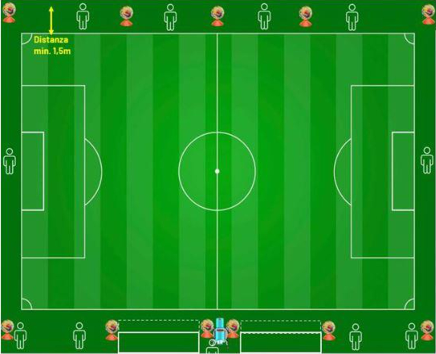 I palloni saranno posizionati, secondo la figura, su appositi supporti plastificati (i cd. “cinesini” che qualsiasi Club utilizza per allenamenti e/o riscaldamento) dinanzi ai led, ad una distanza minima di 1,5 mt. dalle linee di bordocampo, così come il posizionamento dei palloni retroporta (ai corner) deve essere esterno alle aree di rigore ad almeno 1,5 mt. di distanza dalla linea di fondo: il rispetto di tali distanze si rende necessario per non creare eventuali “interferenze” con il VAR. A livello generale e laddove gli spazi lo consentano, la distanza ideale in cui posizionare i palloni rispetto alle linee di bordocampo è pari a 2,5 mt. I raccattapalle dovranno posizionarsi dietro i led bordocampo, ovviamente in prossimità dei palloni.