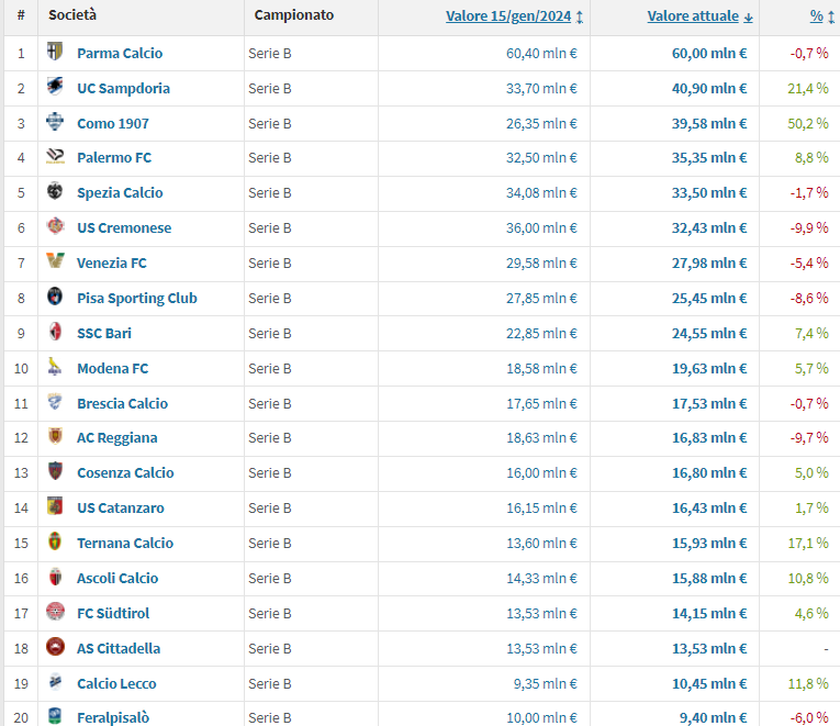 Qual è il valore delle rose di Serie B al termine del calciomercato? Boost del Como impressionante, Feralpisalò ultima