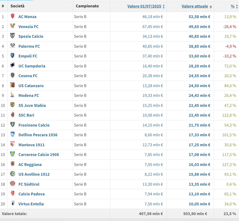 Con la seconda sosta per le Nazionali è ormai entrata nel vivo la stagione di Serie B. È interessante capire come le operazioni dei club e le prestazioni dei calciatori abbiano contribuito a cambiare il valore di mercato delle rose rispetto a quello registrato il 1° luglio. Di seguito il dato di Transfermarkt.
